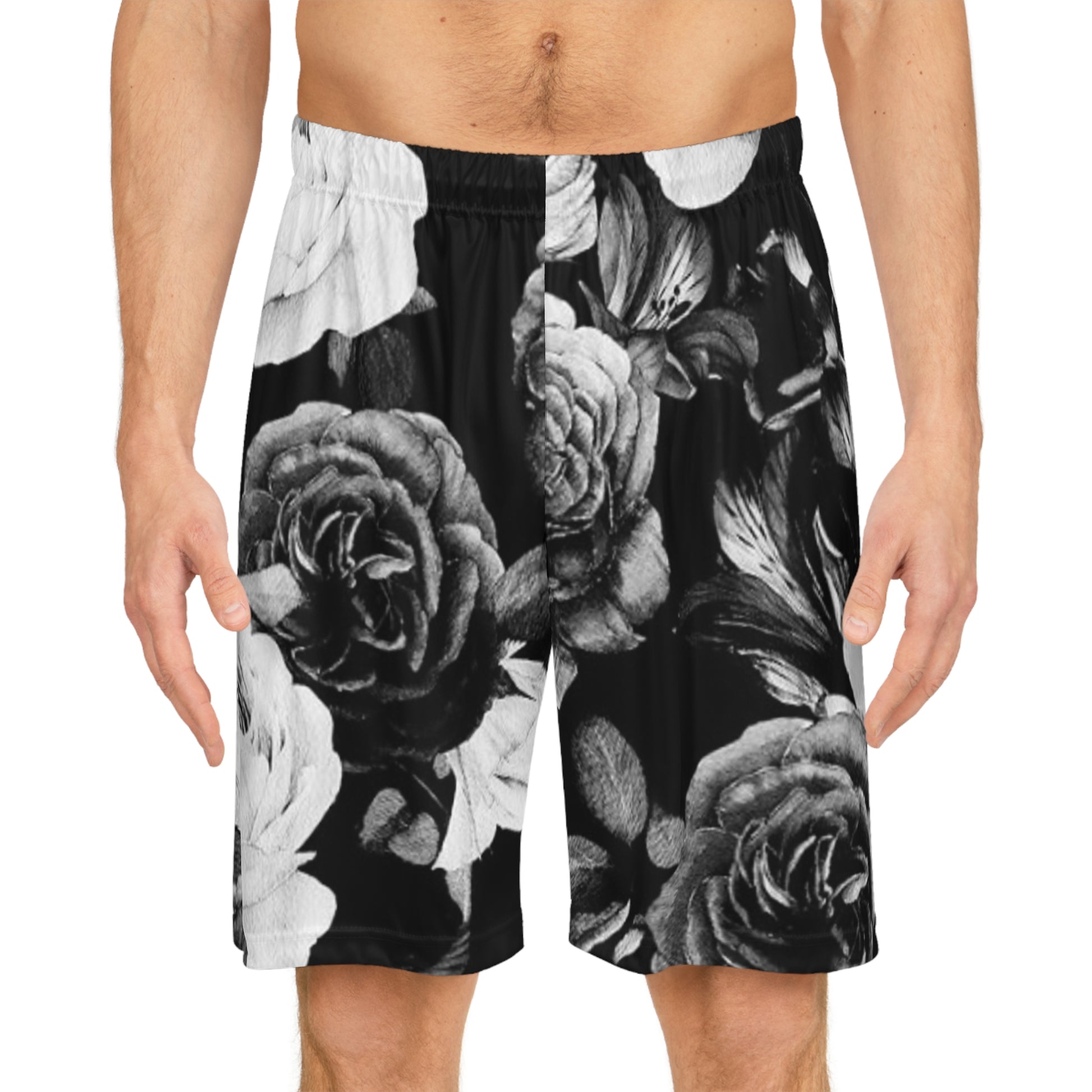 Stay cool and stylish with these Black and White Floral Design Basketball Shorts. The moisture-wicking material and elastic waistband provide a comfortable fit for any physical activity. Perfect for basketball players, athletes, or anyone looking for a fashionable and functional pair of shorts. Great for summer, sports events, and casual wear.