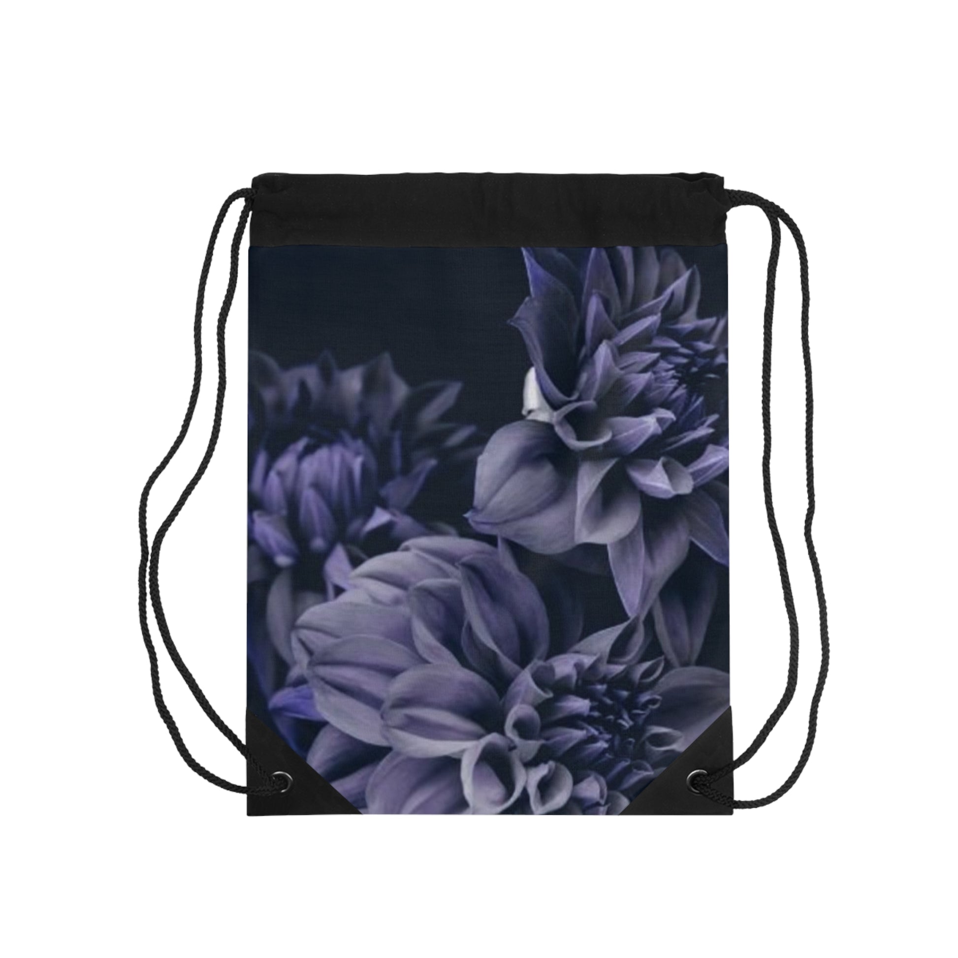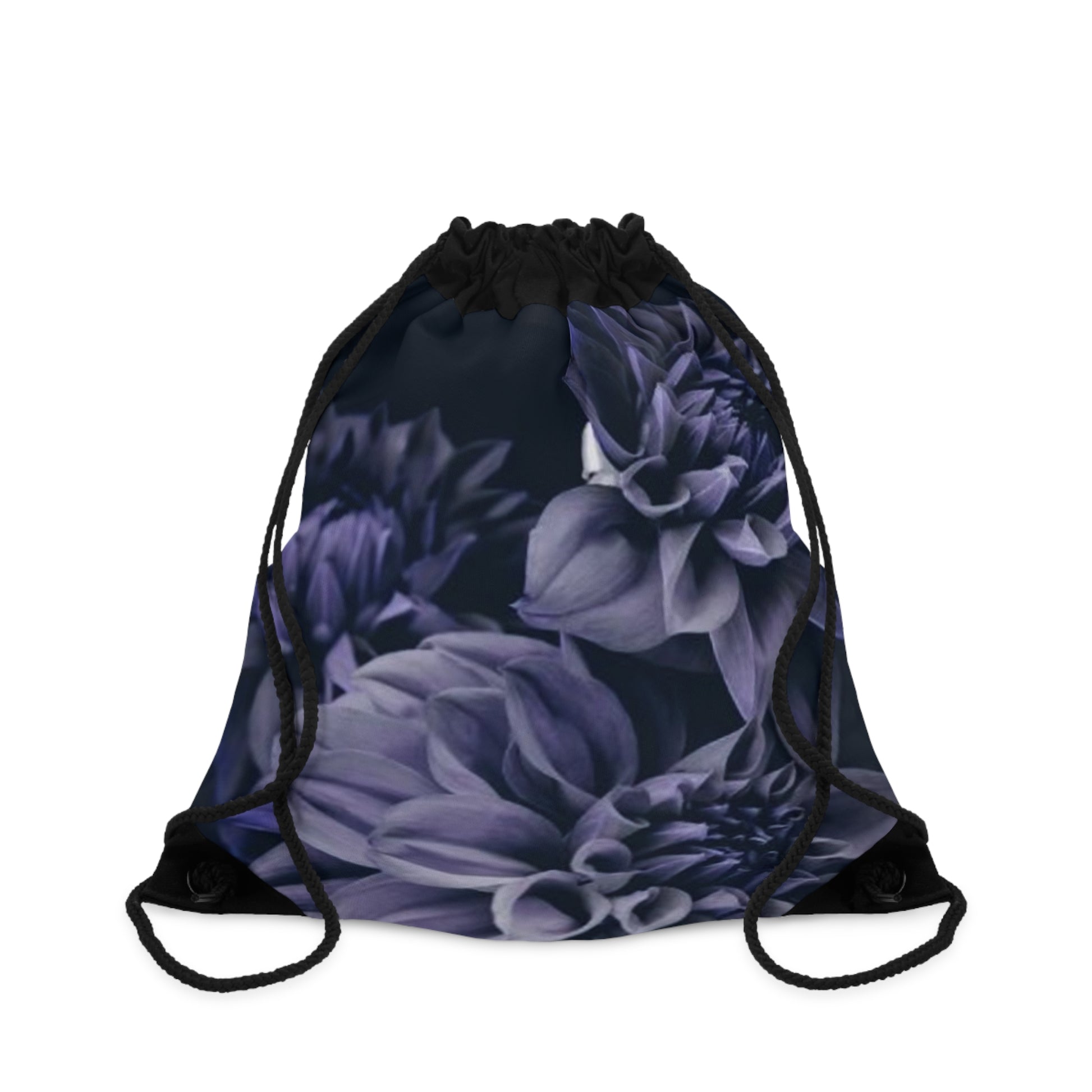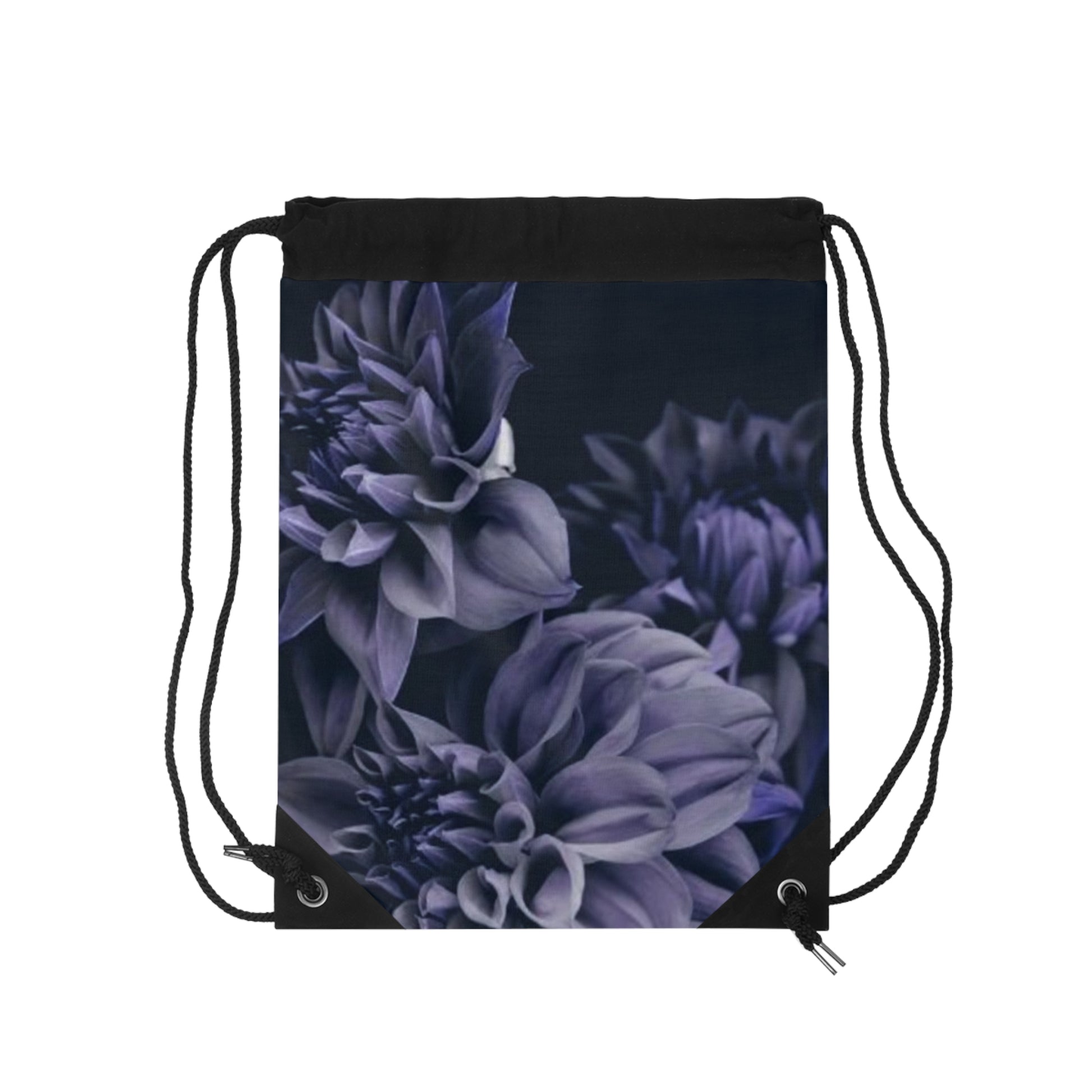 Blue Dahlia Drawstring Bag made of 100% Polyester fabric with metal grommets at the corners. Spacious and fully lined with black sheeting, it also features a small zipper pocket inside. Perfect for carrying essentials in style.