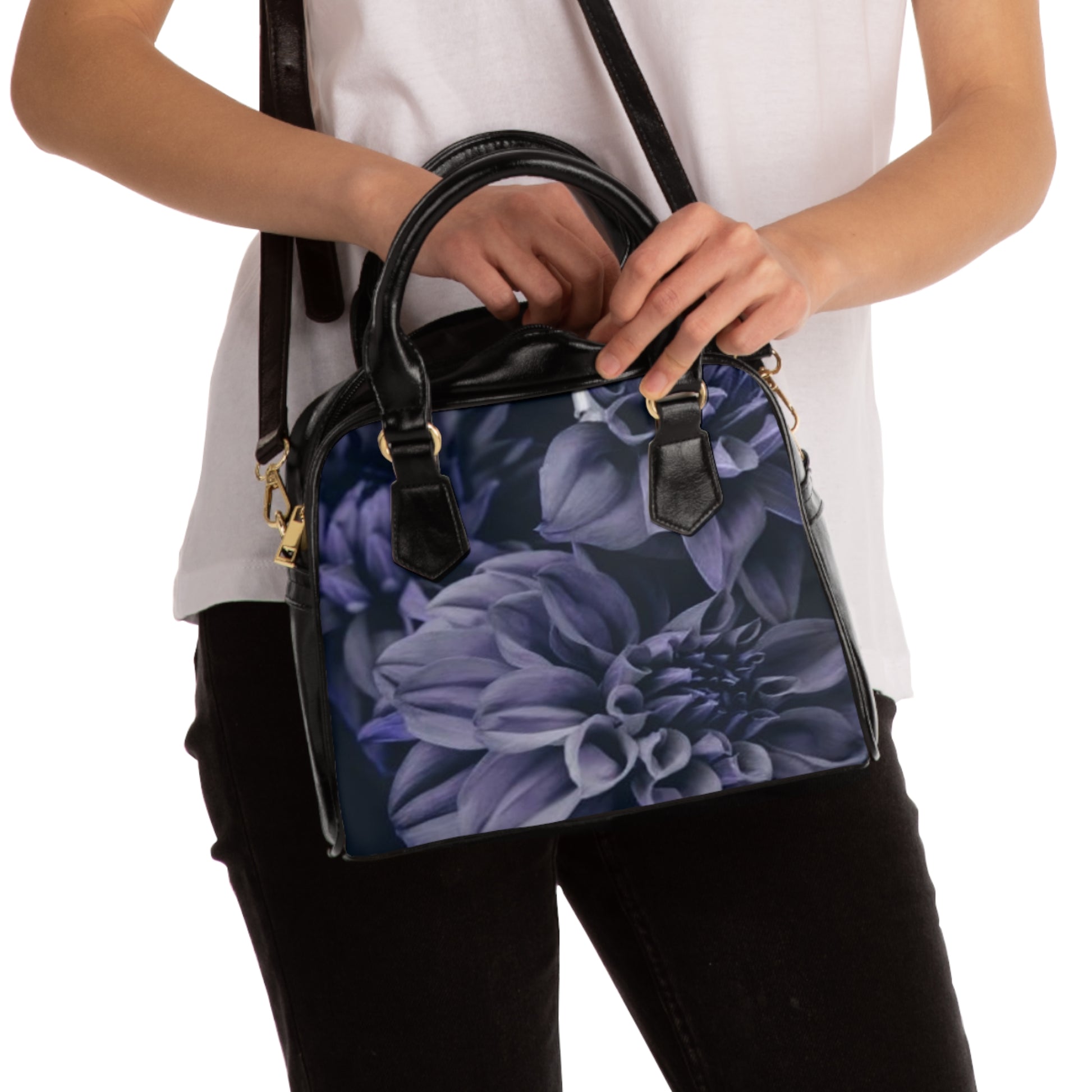 This Blue Dahlia Handbag features vibrant colors and a stylish floral pattern. Made of 100% PU leather, it has a removable and adjustable shoulder strap for convenience. With additional space for storage, this handbag is perfect for the fashion-forward individual looking for a statement piece.