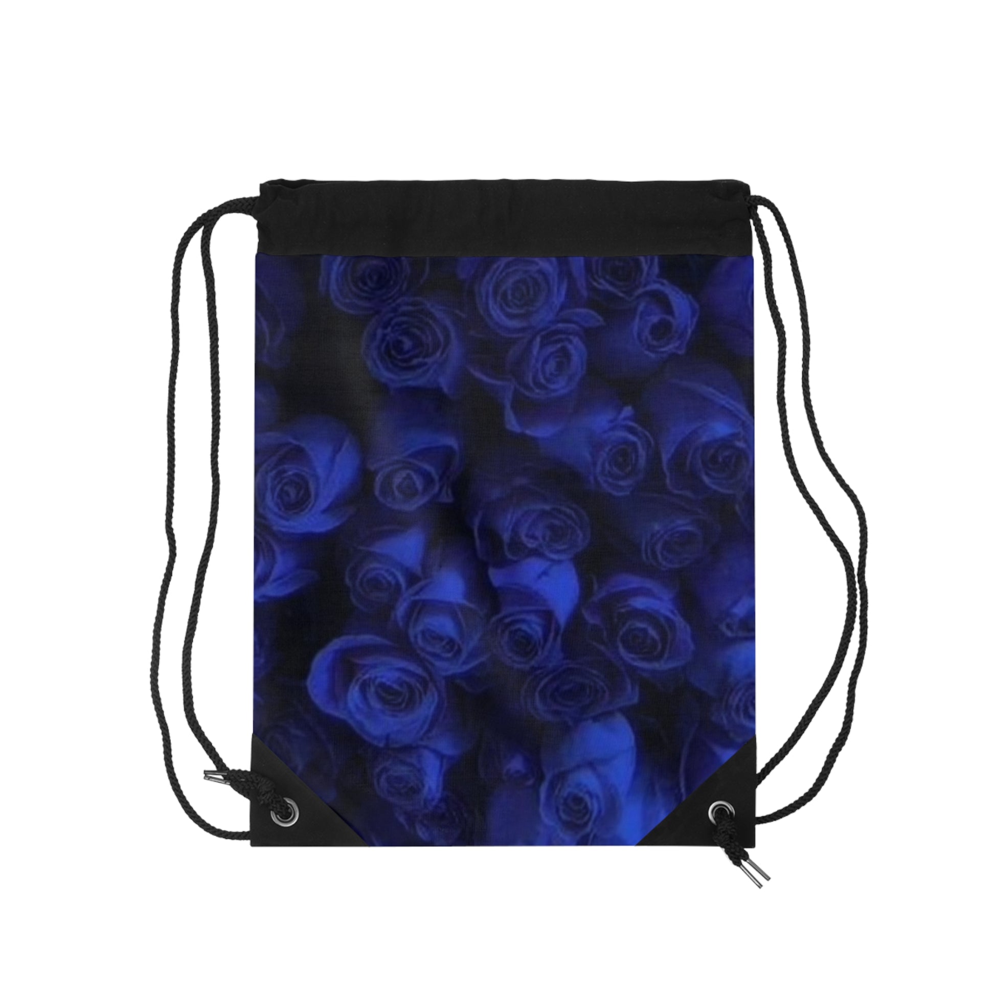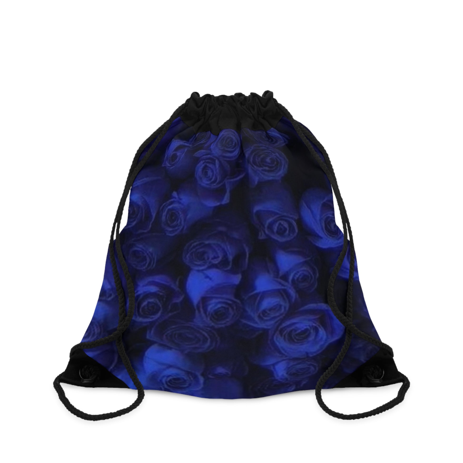 Dark Blue Roses Drawstring Bag made of 100% Polyester fabric with metal grommets at the corners. Spacious and fully lined with black sheeting, it also features a small zipper pocket inside. Perfect for carrying essentials in style.