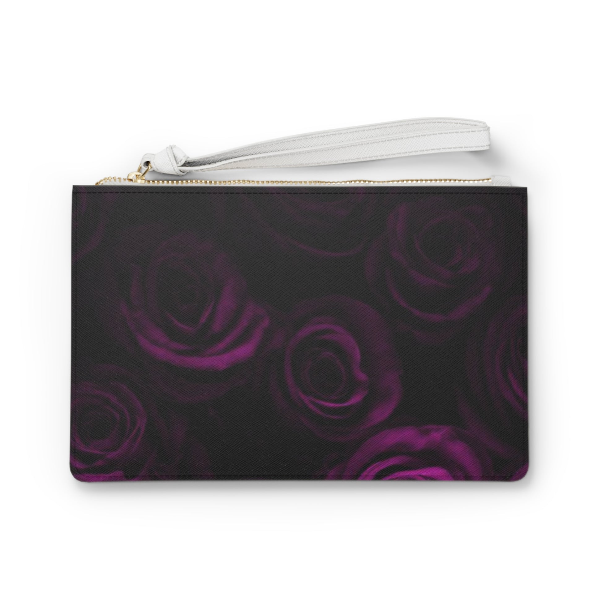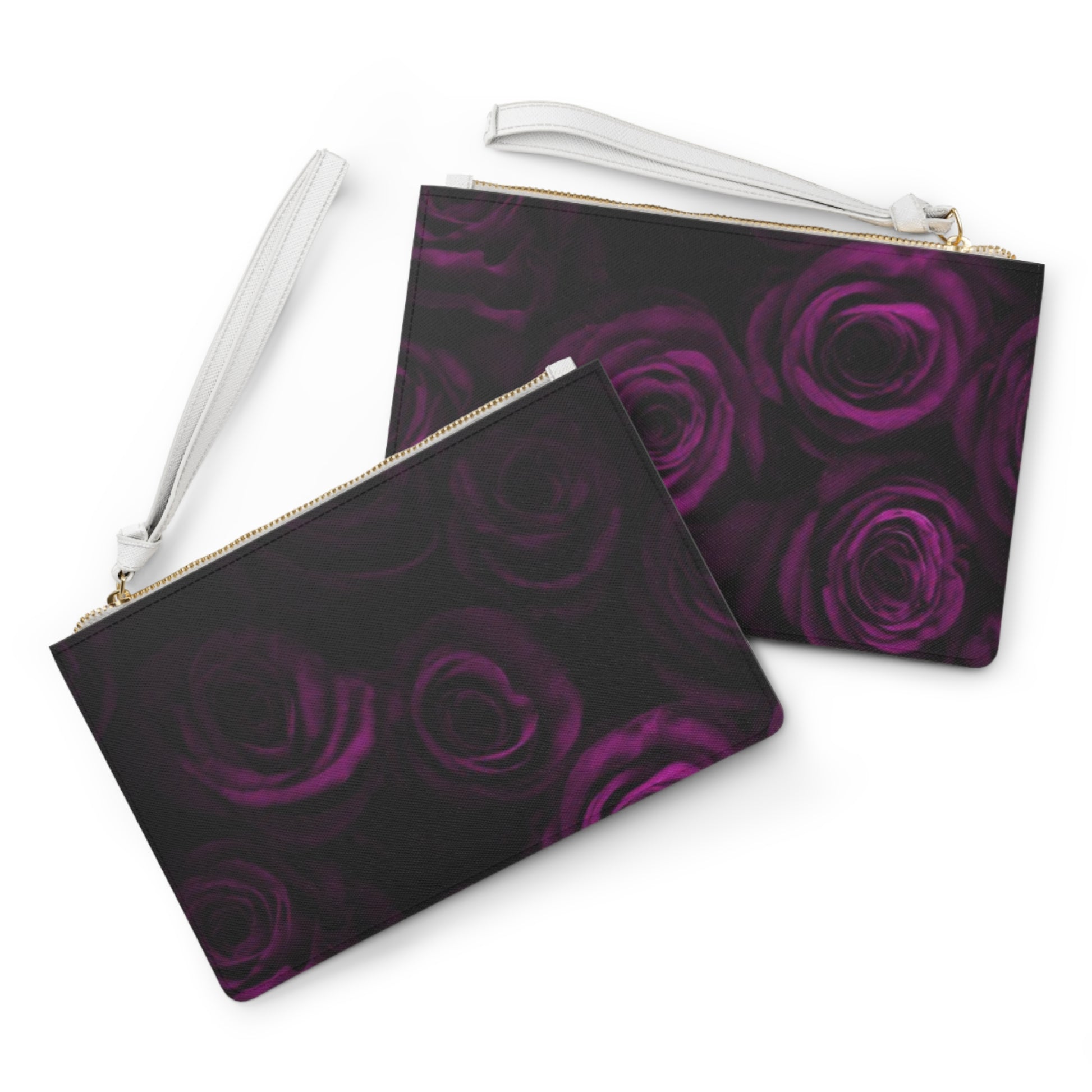 A stylish Dark Purple Roses Clutch Bag made of 100% PU faux leather with a saffiano pattern finish. Features a durable gold colored metal zipper, wrist strap, two compartments, and a small pocket inside. The black lining adds a touch of elegance. Perfect for adding a pop of color and sophistication to your outfit, ideal for a night out or special occasions.
