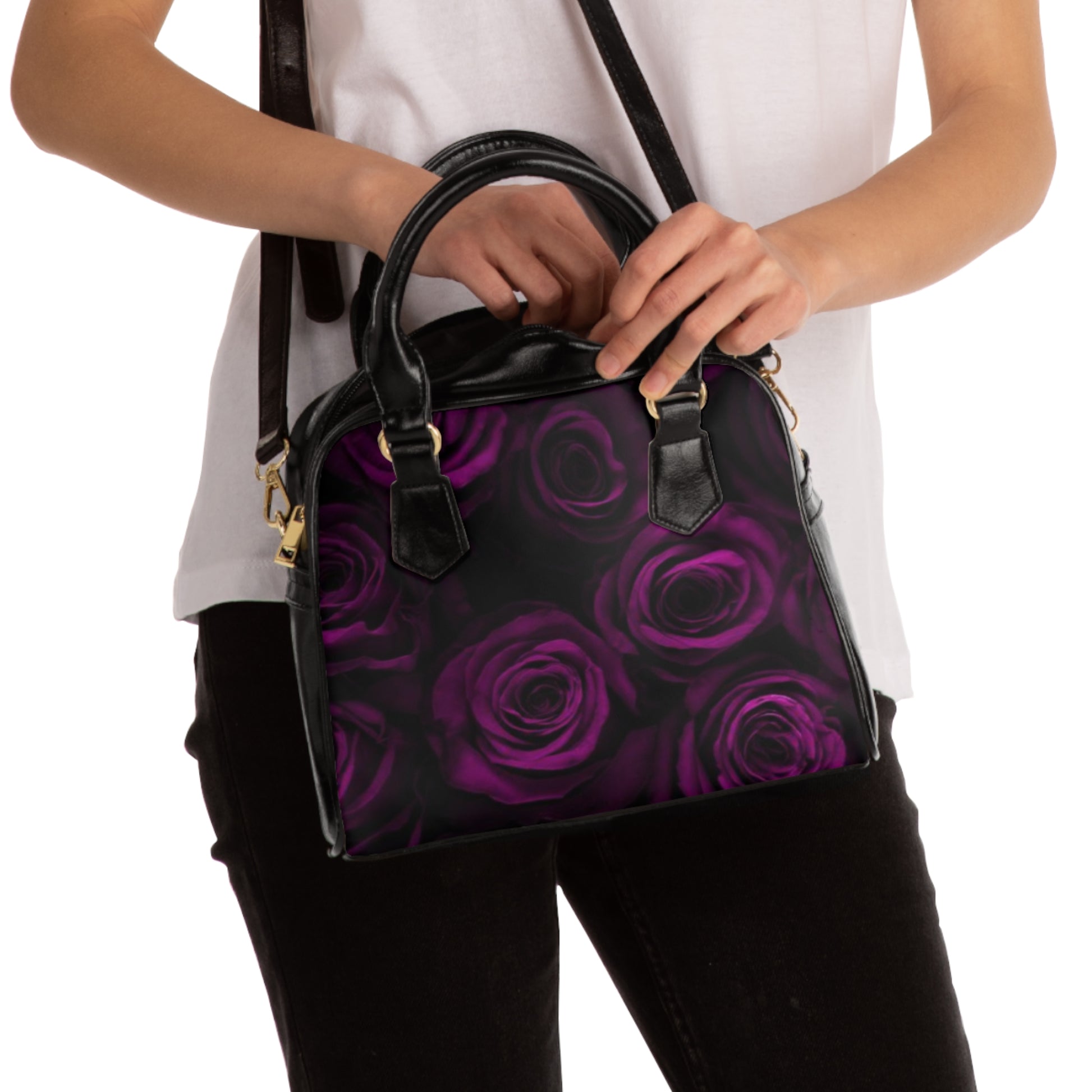 This Dark Purple Roses features vibrant colors and a stylish floral pattern. Made of 100% PU leather, it has a removable and adjustable shoulder strap for convenience. With additional space for storage, this handbag is perfect for the fashion-forward individual looking for a statement piece.