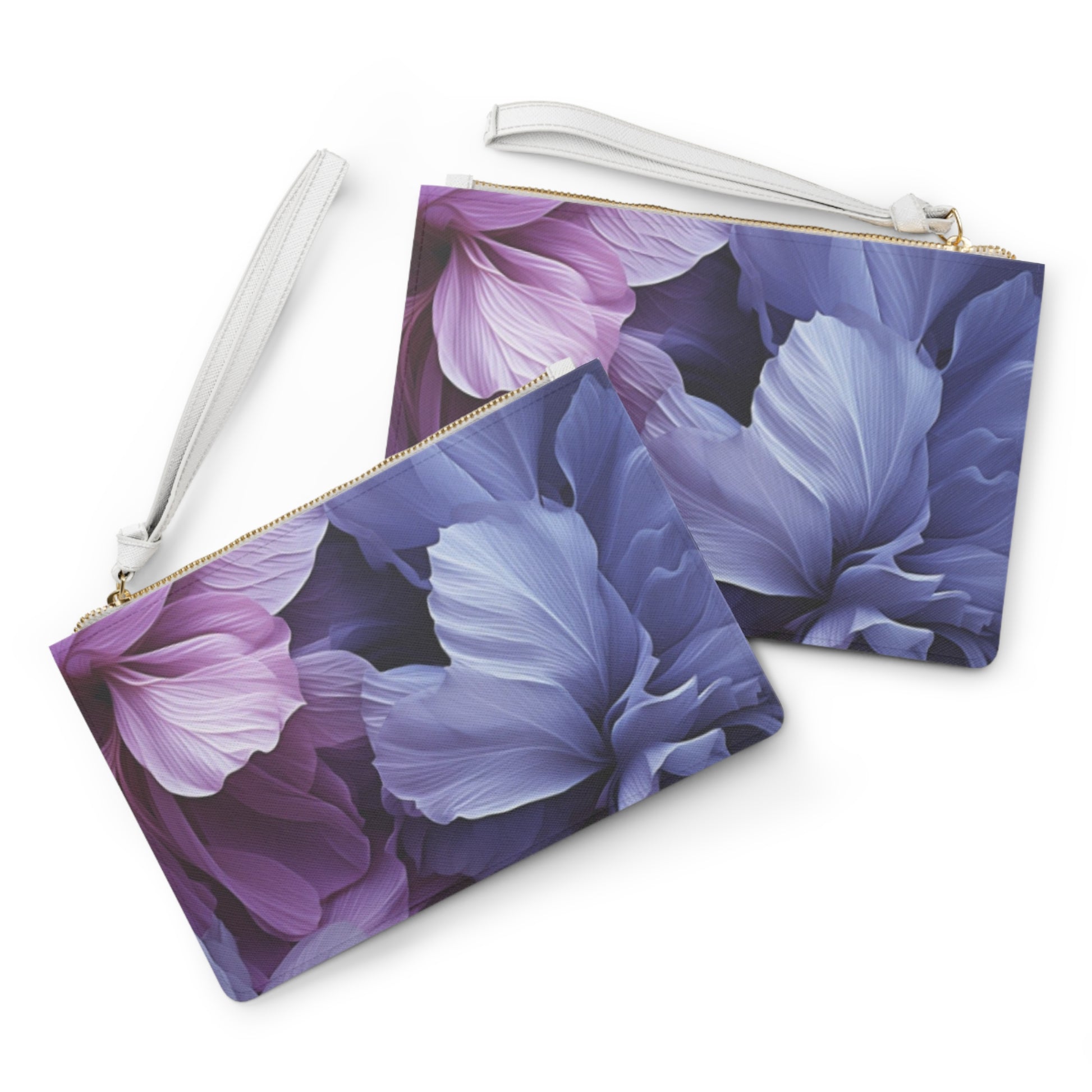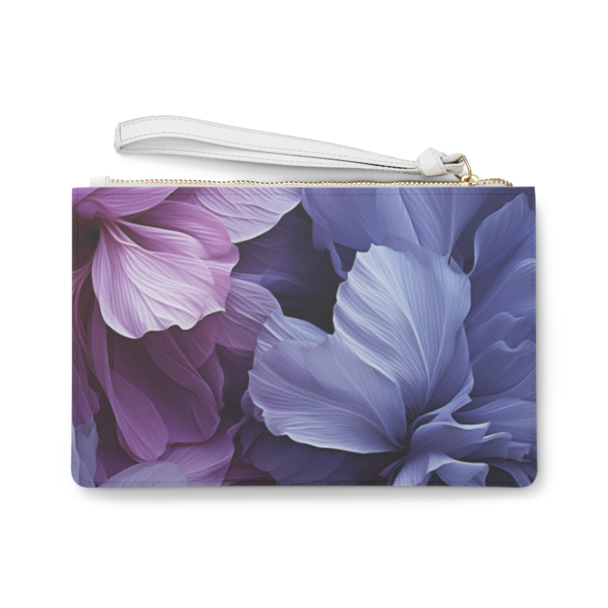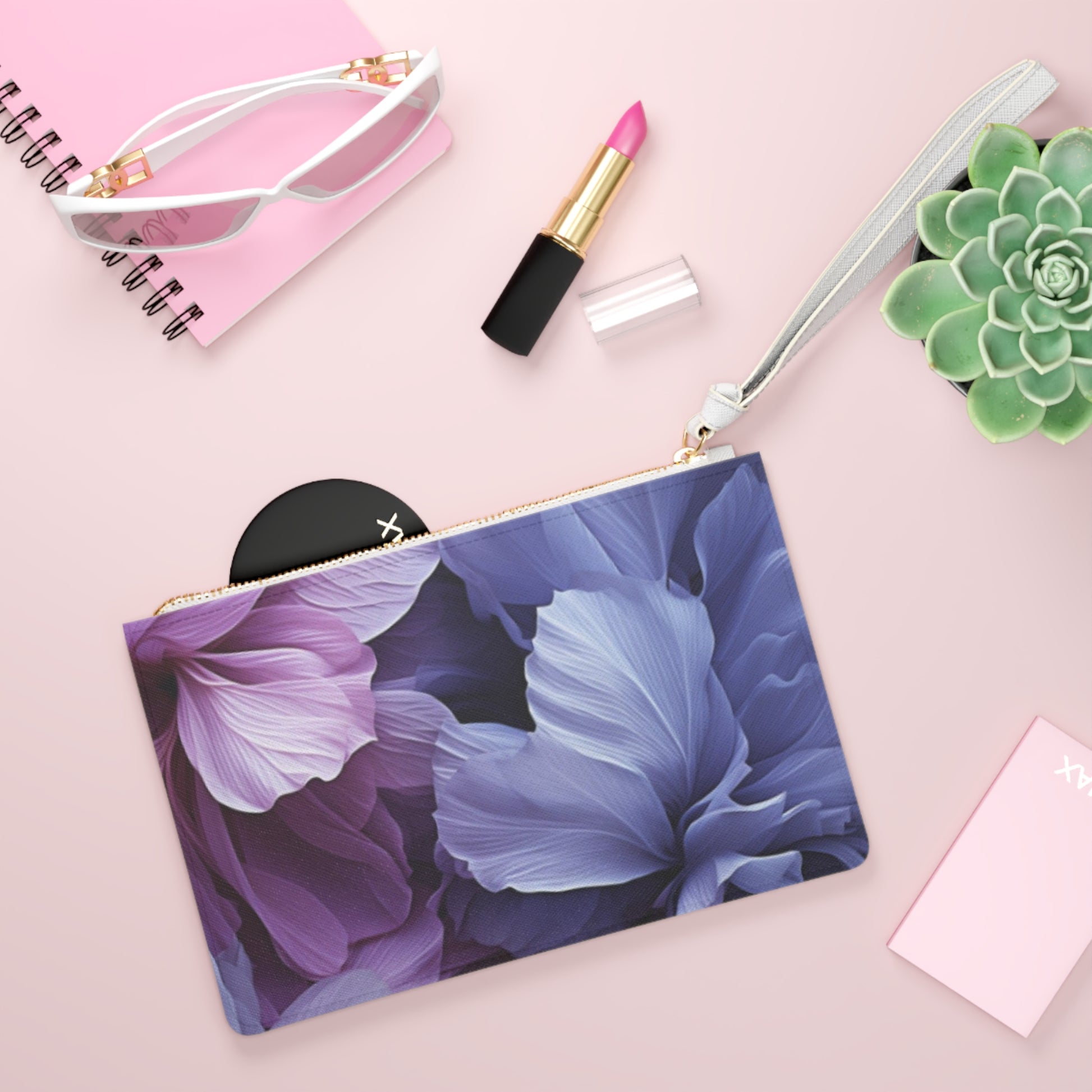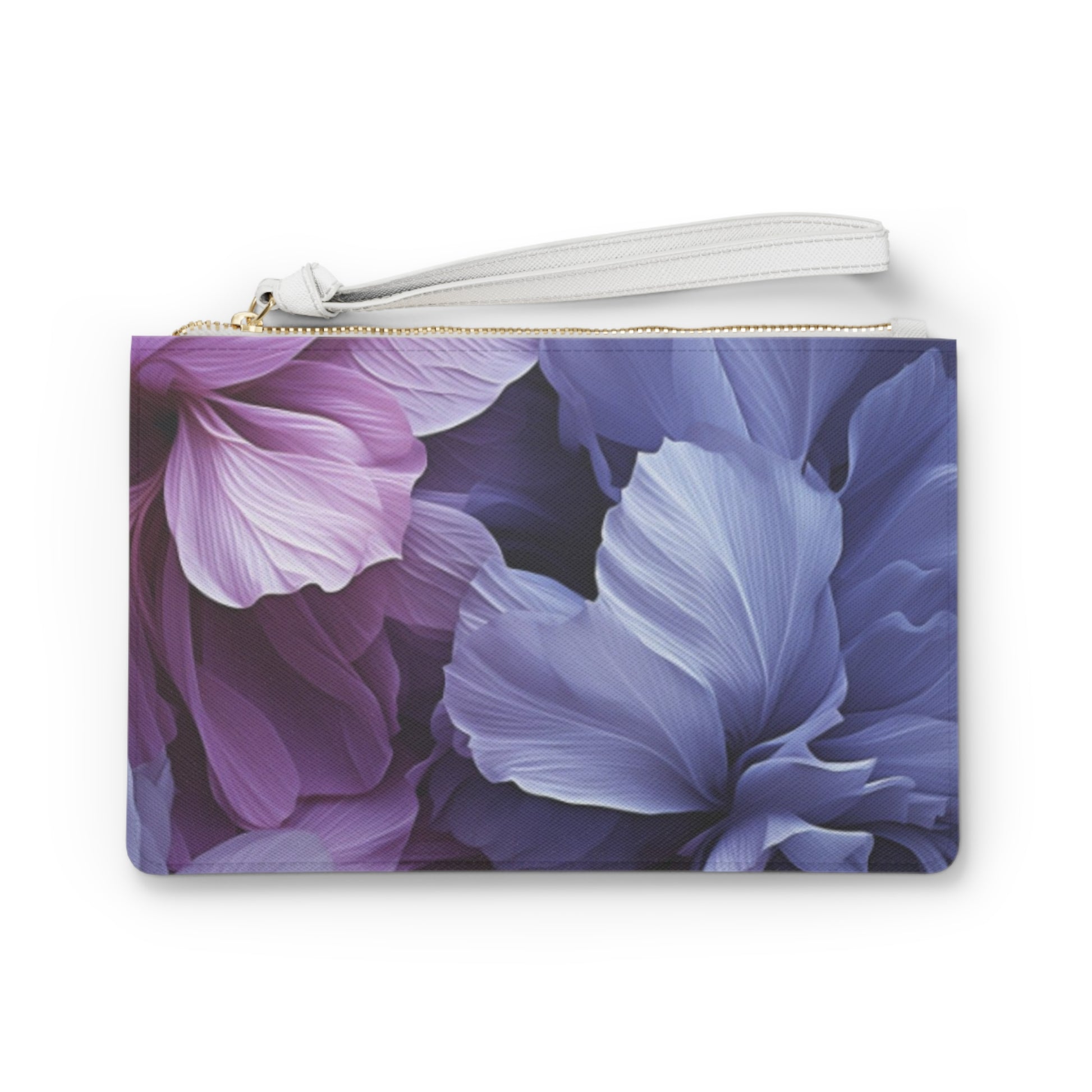 A stylish Floral Flow Clutch Bag made of 100% PU faux leather with a saffiano pattern finish. Features a durable gold colored metal zipper, wrist strap, two compartments, and a small pocket inside. The black lining adds a touch of elegance. Perfect for adding a pop of color and sophistication to your outfit, ideal for a night out or special occasions.