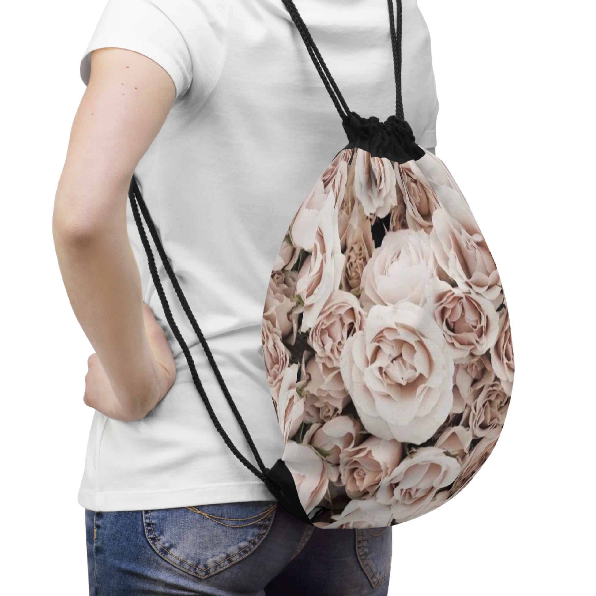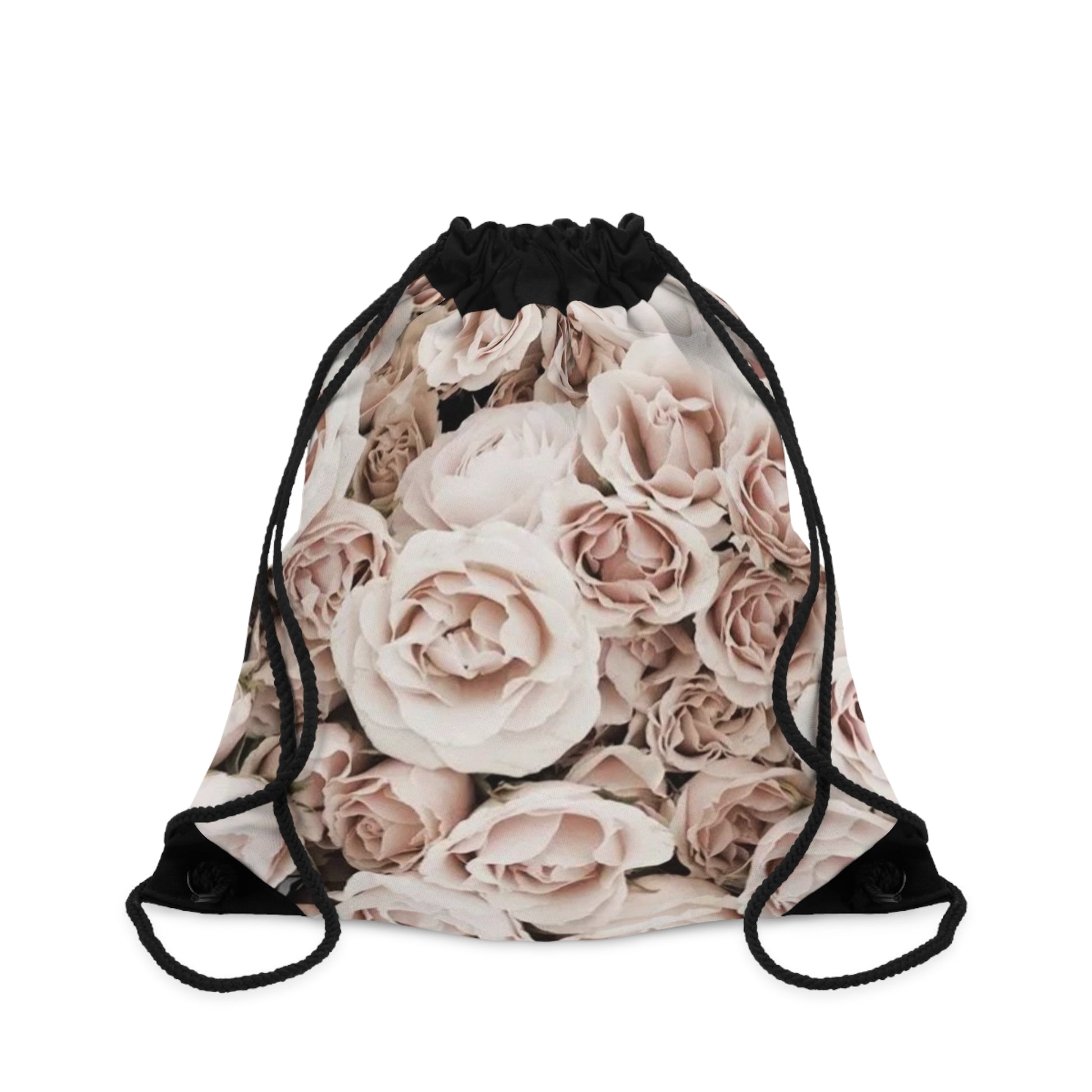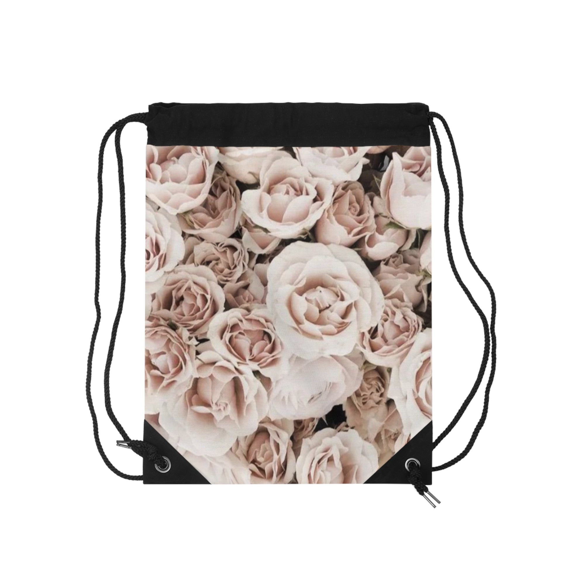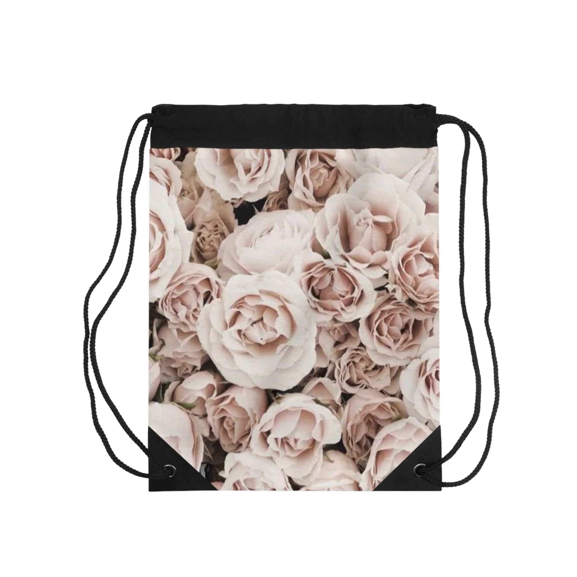 Light Pink Roses Drawstring Bag made of 100% Polyester fabric with metal grommets at the corners. Spacious and fully lined with black sheeting, it also features a small zipper pocket inside. Perfect for carrying essentials in style.