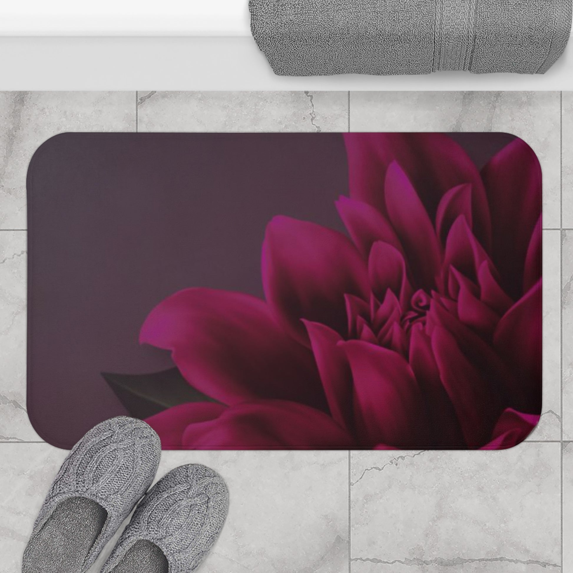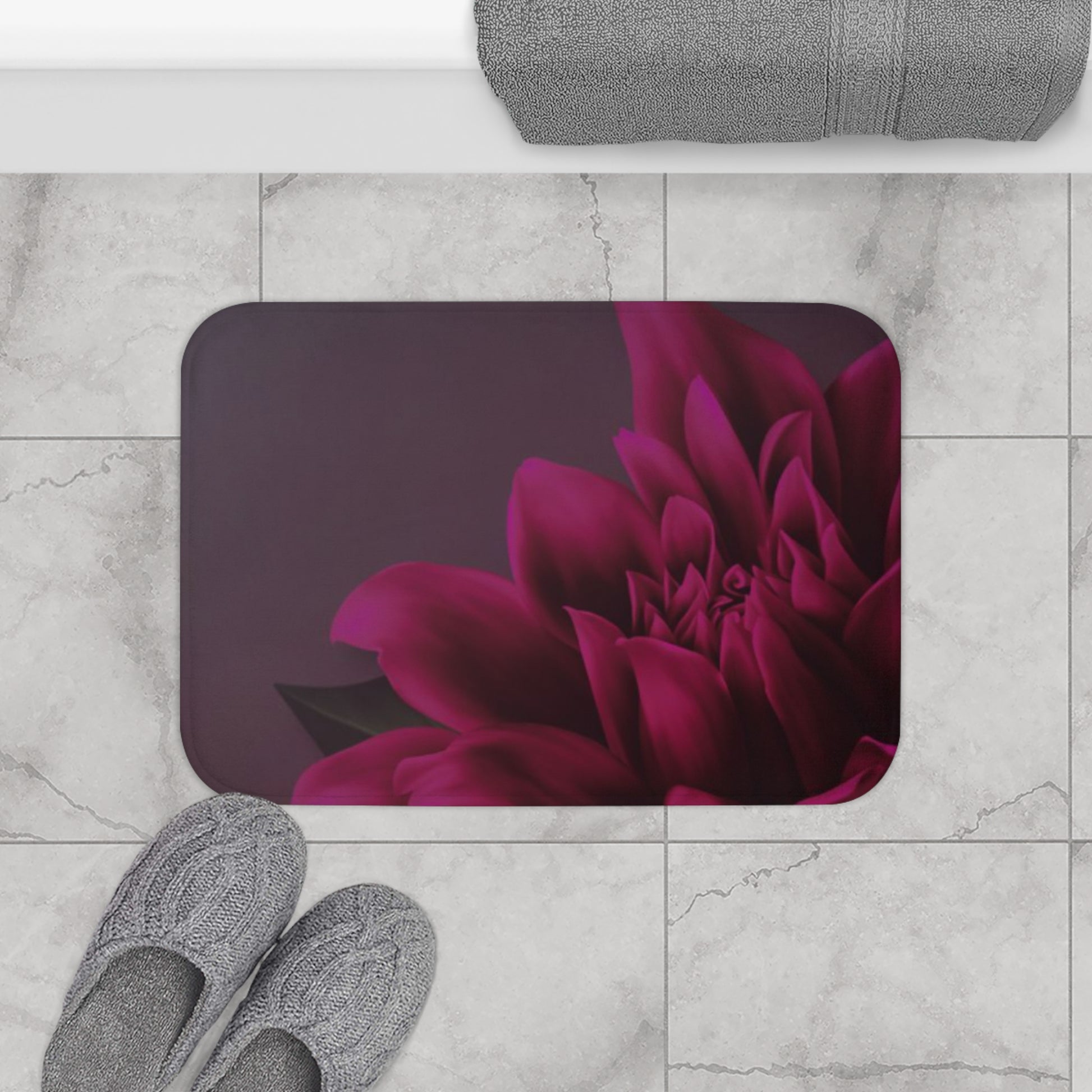 This magenta dahlia bath mat is made of 100% memory foam microfiber, providing perfect comfort and support to your feet. With an anti-slip backing, it stays firmly in place to reduce the risk of slipping. The reinforced binding around the edges ensures durability and longevity. This bath mat is a perfect addition to any bathroom, adding a touch of elegance and functionality. Ideal for anyone looking to upgrade their bathroom decor or looking for a cozy feel after a relaxing bath. Perfect for housewarming gifts, birthdays, and holiday presents.