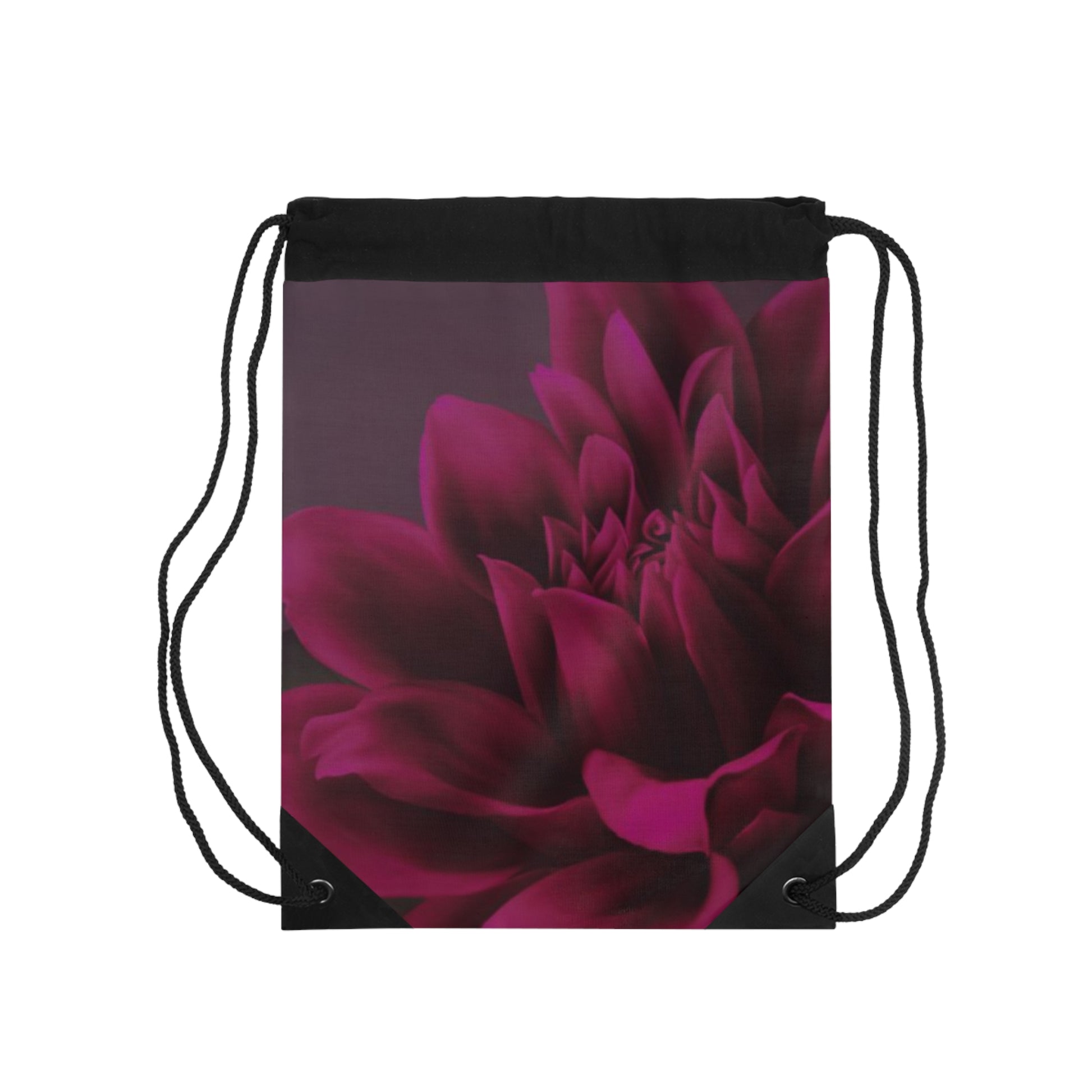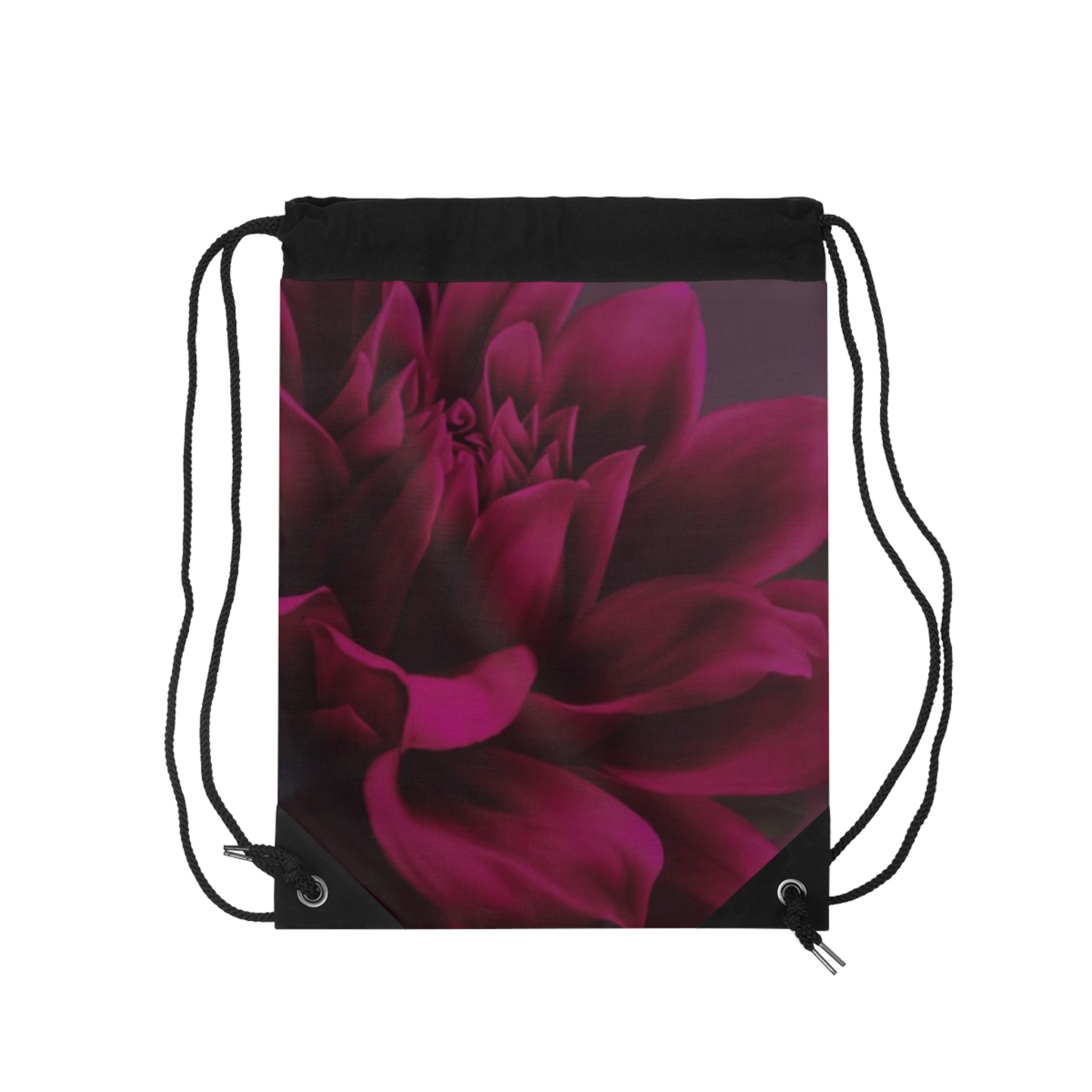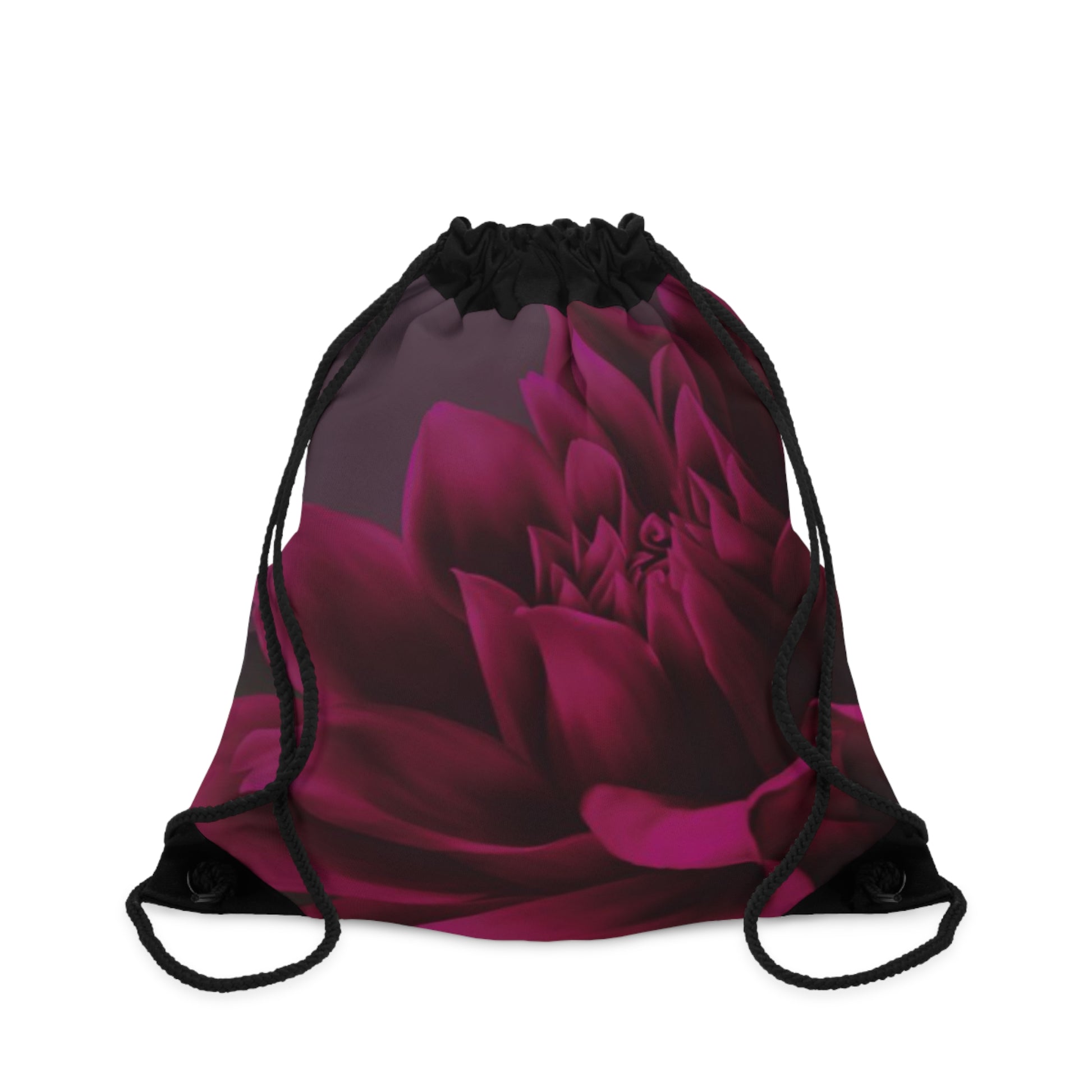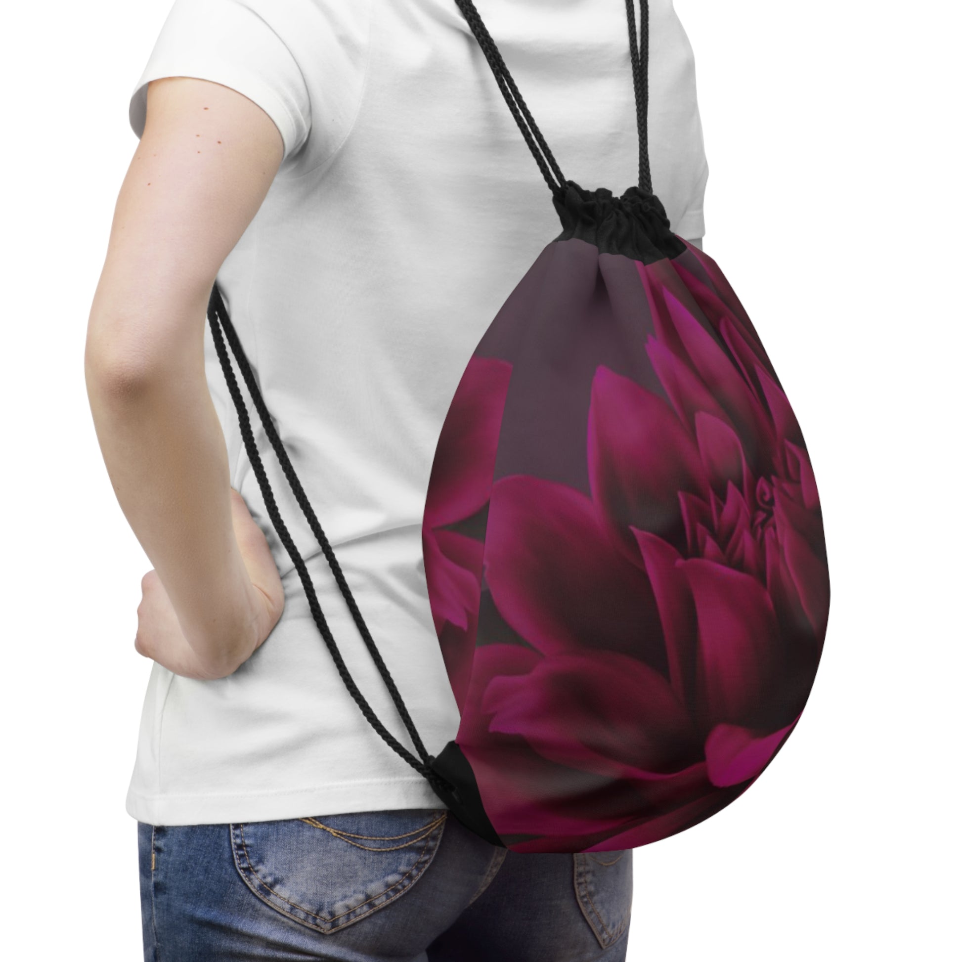 A Floral Drawstring Bag made of 100% Polyester fabric with metal grommets at the corners. Spacious and fully lined with black sheeting, it also features a small zipper pocket inside. Perfect for carrying essentials in style.