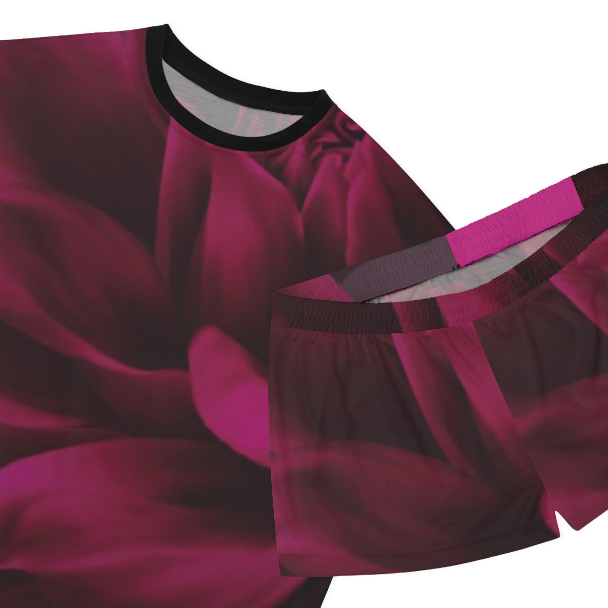 Why pick between comfort or style when you can have both? These women's magenta dahlia short pajama two-piece set come with a relaxed fit, a ribbed collar and feature no sleeve seams. Add your designs in all-over print, and create a cozy staple that is bound to be loved.