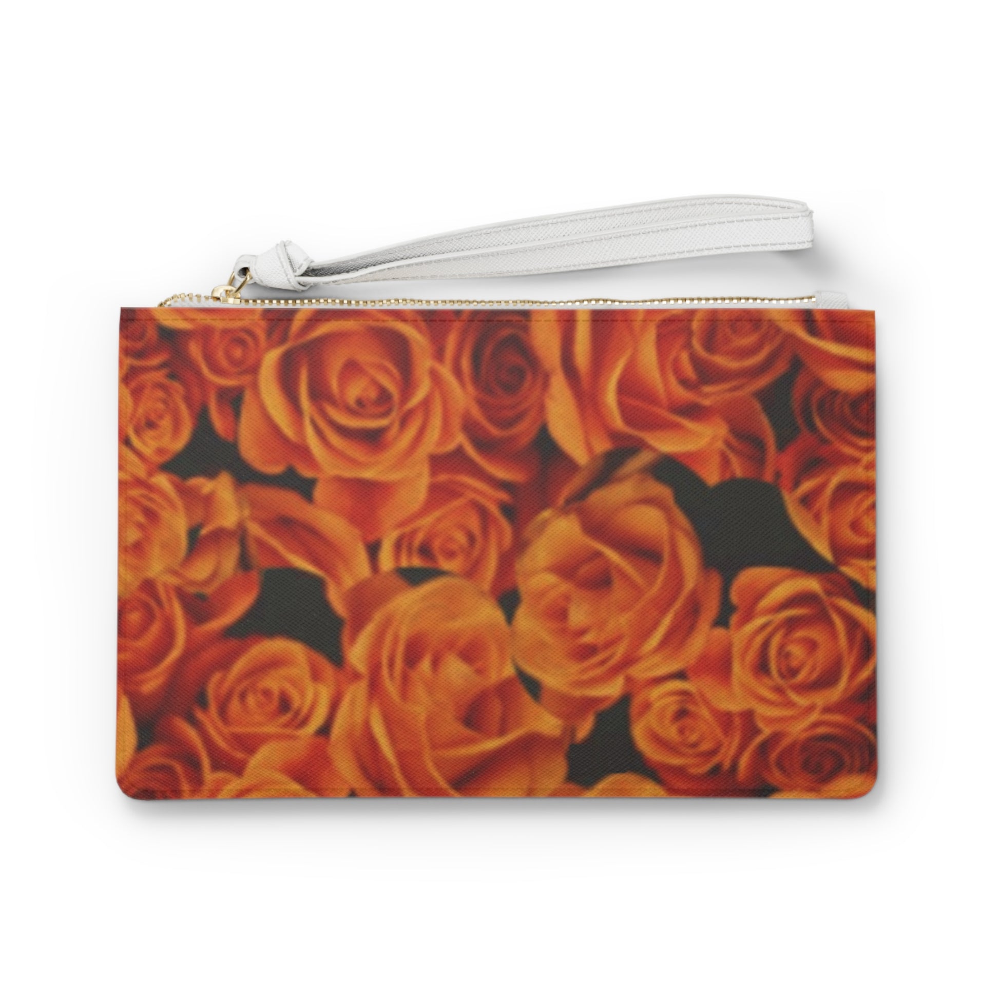 A stylish Orange Roses Clutch Bag made of 100% PU faux leather with a saffiano pattern finish. Features a durable gold colored metal zipper, wrist strap, two compartments, and a small pocket inside. The black lining adds a touch of elegance. Perfect for adding a pop of color and sophistication to your outfit, ideal for a night out or special occasions.